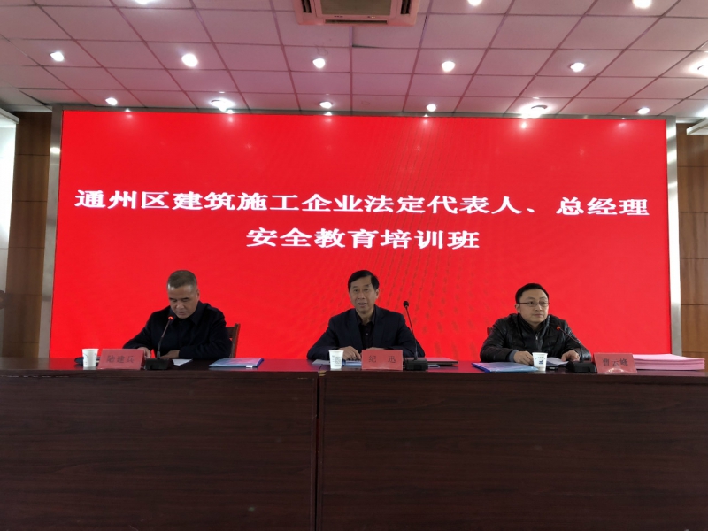 2019年2月20日,通州区建筑施工企业法人代表、总经理安全教育培训班在我校召开。区安监部门的领导专家到会并作出指导。会议强调要深入学习贯彻习近平总书记关于安全生产工作的重要讲话指示精神,落实国务院有关领导同志批示要求,按照省委、省政府部署,深刻汲取近期安全生产事故教训,举一反三,全面压实责任,全面拉网排查,全面防控监管,全面补齐短板,严之又严、实之又实、细之又细做好安全生产工作,坚决遏制重特大事故发生,切实维护人民群众生命财产安全和社会大局稳定。