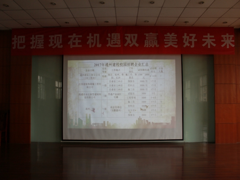 2017年4月26日,通州建校双向选择校园招聘会启幕。本次招聘会有通州建总集团有限公司和旗下的多家分公司、南通卓强建设集团有限公司、通州二建等多家知名建筑企业单位参加。招聘会开始前一小时,众多企业负责人和应聘者已陆续到达。上午9点,整个会场已是磨肩擦掌,人声鼎沸。