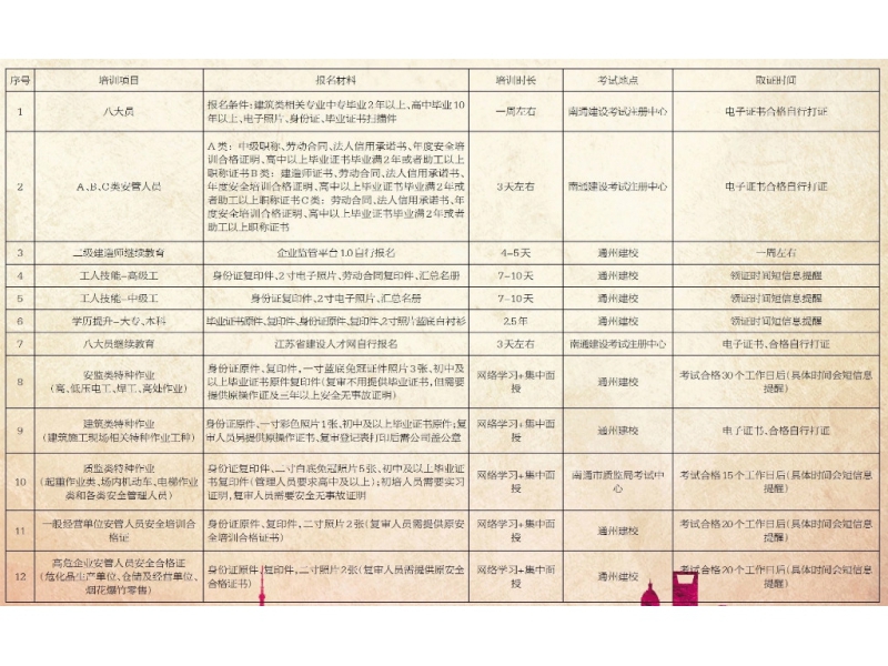 中心职业技能培训与通州建筑职工中等专业学校合作,拥有一流的教学环境、先进的教育设备和经验丰富的专职教师队伍。培训科目有:大专、本科学历提升;中、高级、技师工人技能晋级;施工员、质检员等建筑八大员和建造师考前辅导及继续教育;安监类高、低压电工、焊工、高处作业和建筑施工现场相关特种作业操作证培训等。培训结束后,组织参加相关主管部门考试,合格后即按规定发放证书。另外,与财政管理部门合作举办的会计继续教育、职称资格考试培训等项目也将在近期推出。